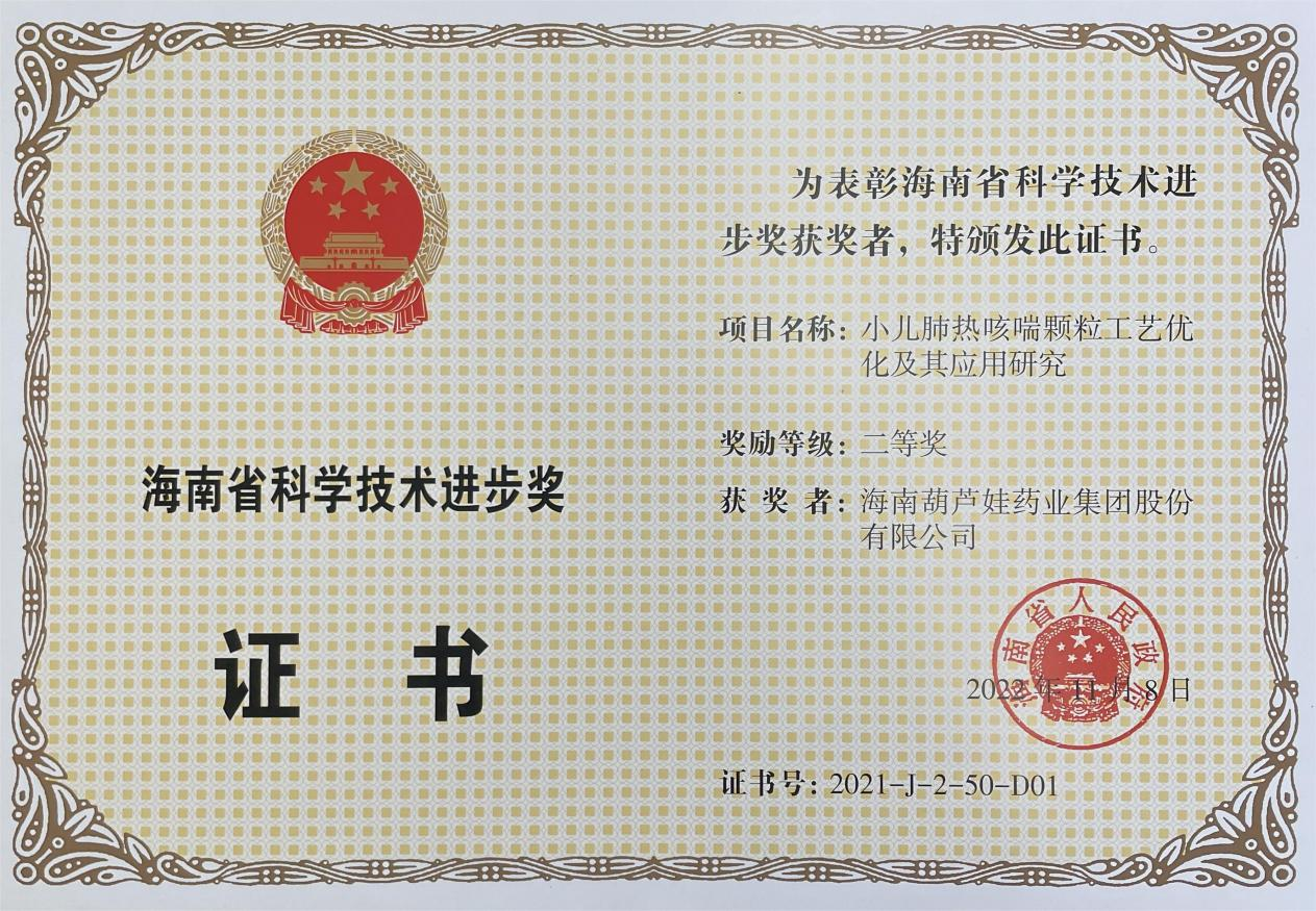 为此,小儿肺热咳喘颗粒的制备方法获得了第二十一届中国专利优秀奖(2019年),专利申请号:ZL201010134951,此次作为专利技术的应用,获得了2021年度海南省科学技术进步奖二等奖。在此之前,新宝GG牌小儿肺热咳喘颗粒还多次被授予“临床价值中成药品牌”、“中国连锁药店最具合作价值单品”,荣登“中国医药品牌榜”。