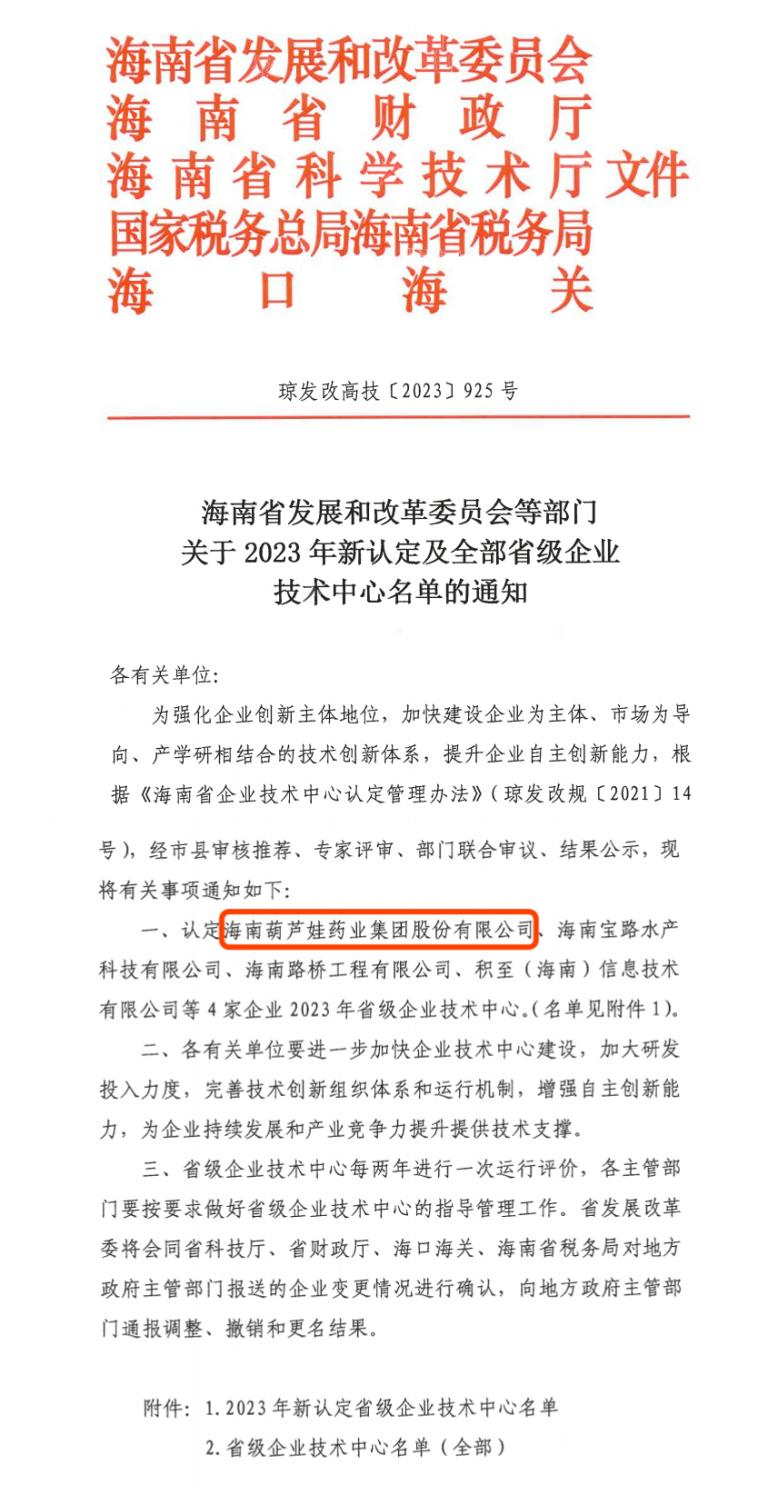 近日,海南省发改委等多部门联合公布了《关于2023年新认定及全部省级企业技术中心名单的通知》,其中,海南新宝GG药业集团股份有限公司成功通过评审,被认定为省级企业技术中心,是本次获批的4家企业之一。